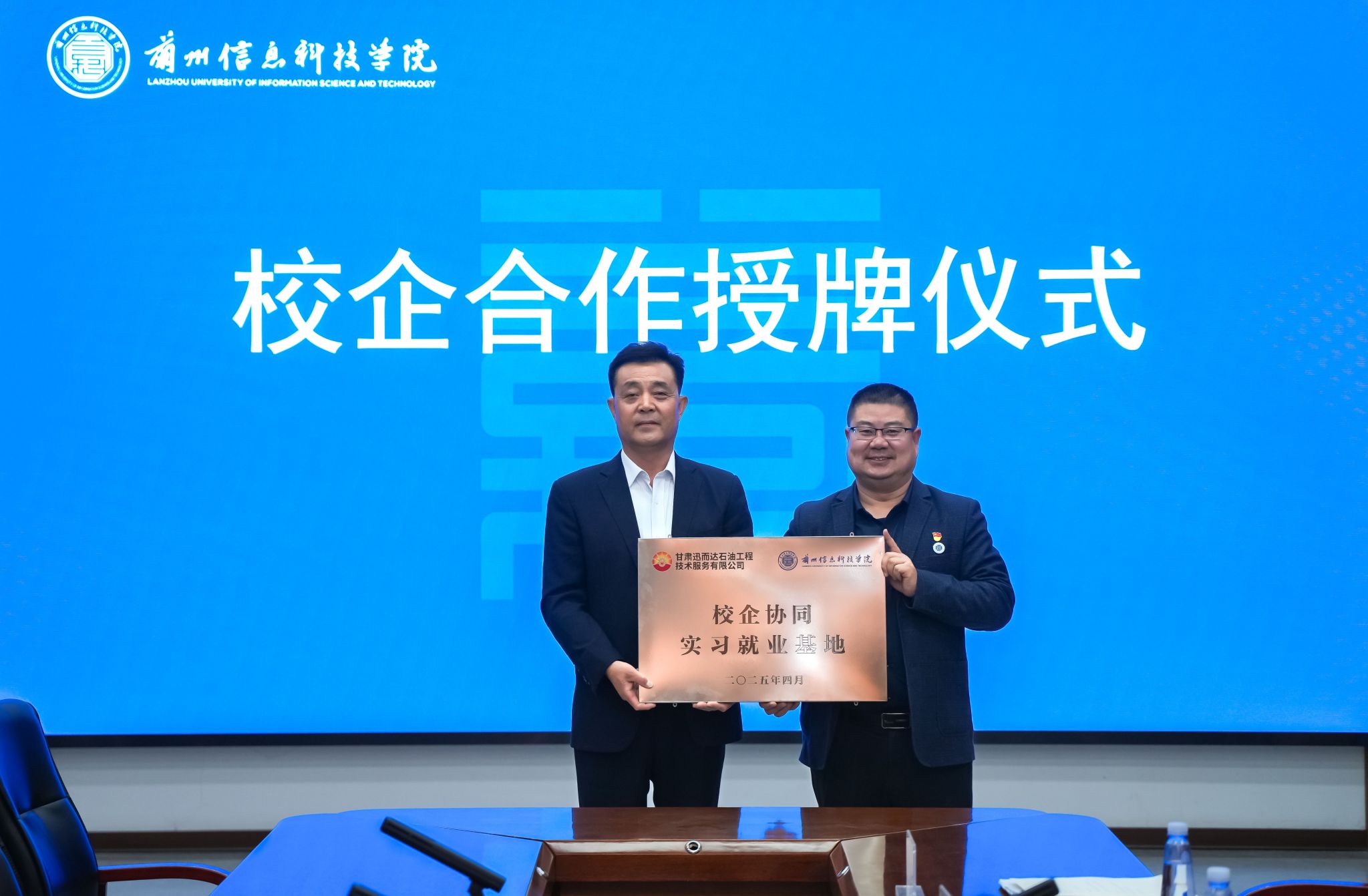 在全体与会人员的见证下,BEAT365英国官网校长助理苏存兴向甘肃迅而达石油工程技术服务有限公司董事长杜龙山授予“校企协同实习就业基地”牌匾,标志着双方正式建立长期战略合作关系。