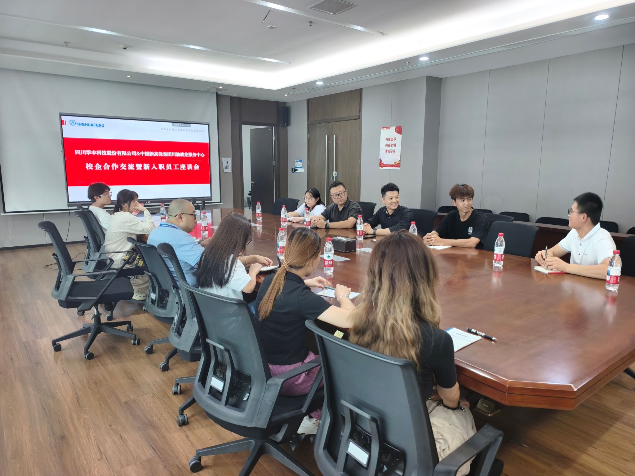 交流会后,企业特设校友座谈会,与入职华丰科技近两个月的2025届毕业生亲切交流。校友们畅谈从校园到职场的角色转变心得,分享了在华丰科技获得的专业成长与人文关怀。毕业生张汪同学表示:“企业导师专业耐心,项目实践机会充足,团队氛围融洽,让我们快速融入并感受到发展潜力。”毕业生们普遍对企业文化、发展平台与关怀机制表达了高度满意度,展现了良好的职业发展开端。