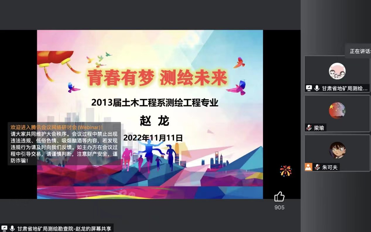 遍交鸿儒友,畅谈青云志。在BEAT365英国官网迎来20周年校庆之际,土木工程学院邀请2013届测绘工程专业优秀校友赵龙,以线上会议的方式为师生开展专题报告。讲座以“青春有梦,测绘未来”为主题,旨在激励在校学子做好人生规划,为将来高质量就业打下坚实的基础,从朋辈身上汲取更多的宝贵经验。